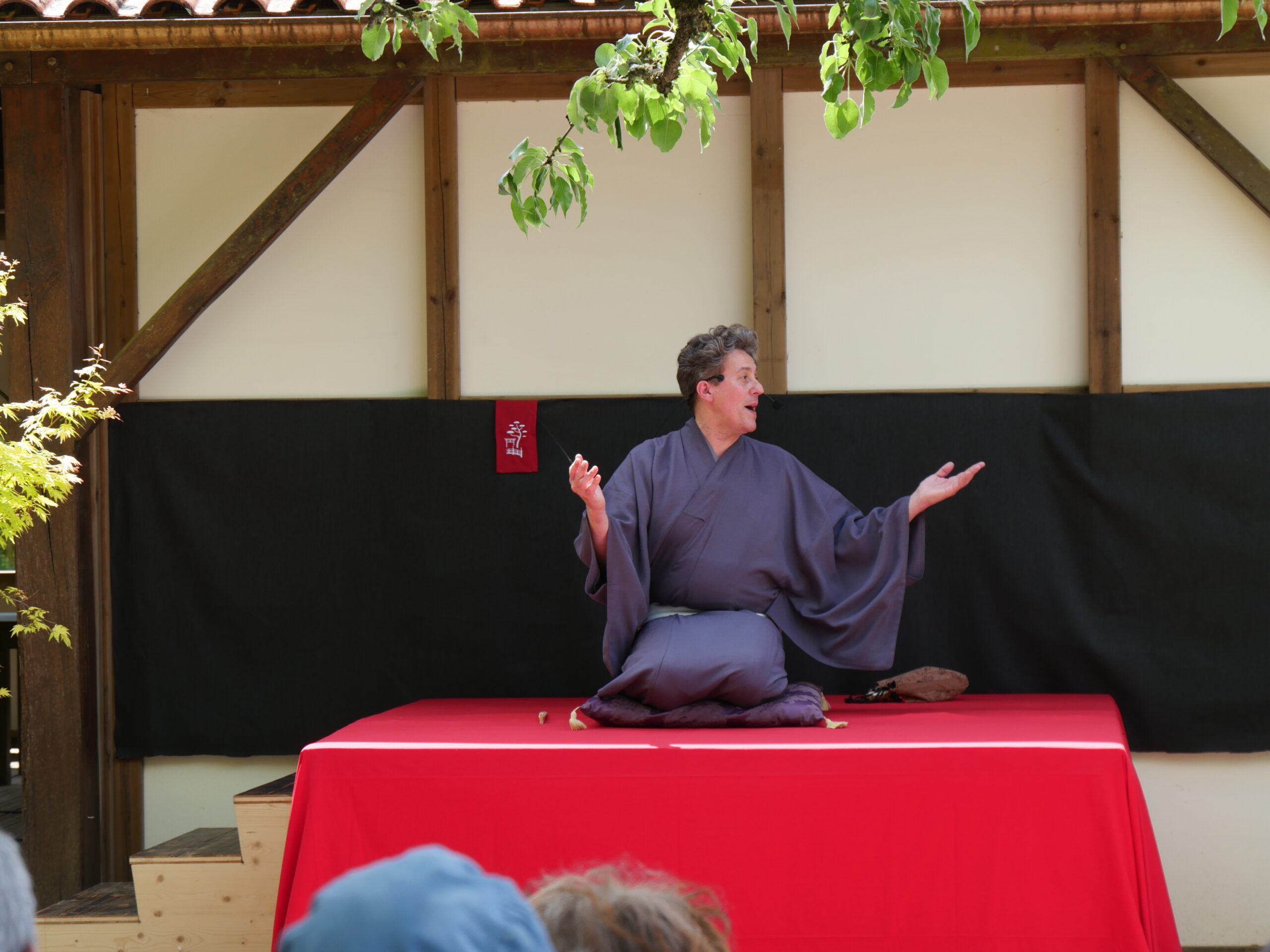 Le conteur assis sur les genoux interprète son histoire et mime, à l’aide d’un éventail et d’un tissu, les